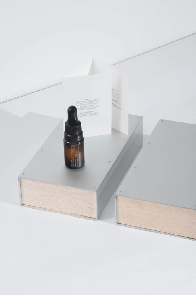 Existe una conexión entre la elección de la planta y la morfología del objeto en relación a la imagen de un estetoscopio. El contenedor situado en la zona del plexo y el corazón, amuleto de apertura y equilibrio, imprime el aroma a través del caucho como medio entre el aceite y el cuerpo.